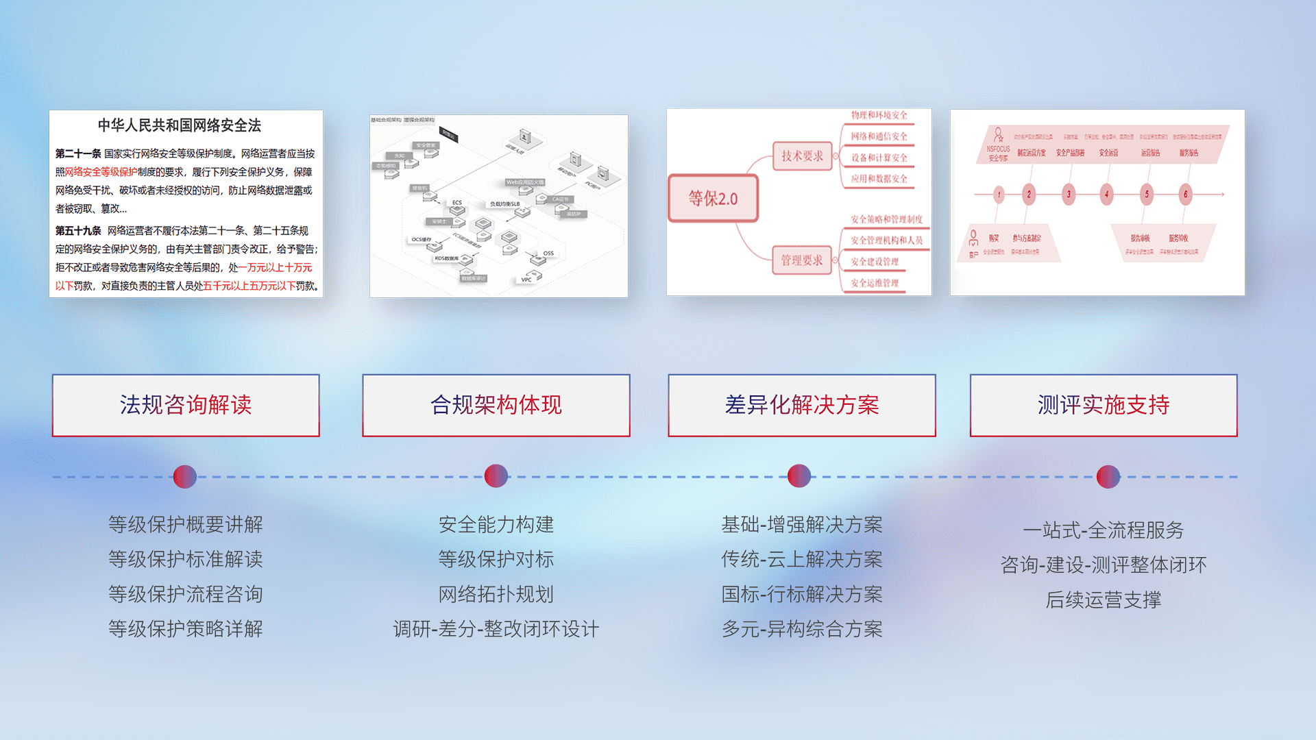 通过专业的法律咨询解读、、、合规架构体现、、、差异化解决方案、、、测试实施支持等服务,,为客户量身打造等保合规体系。。。。